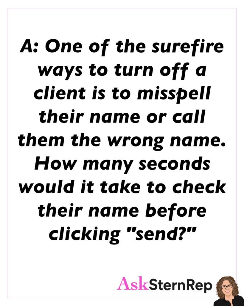 One of the surefire ways to turn off a client is to misspell their name or call them the wrong name. How many seconds would it take to check their name before clicking “send?”